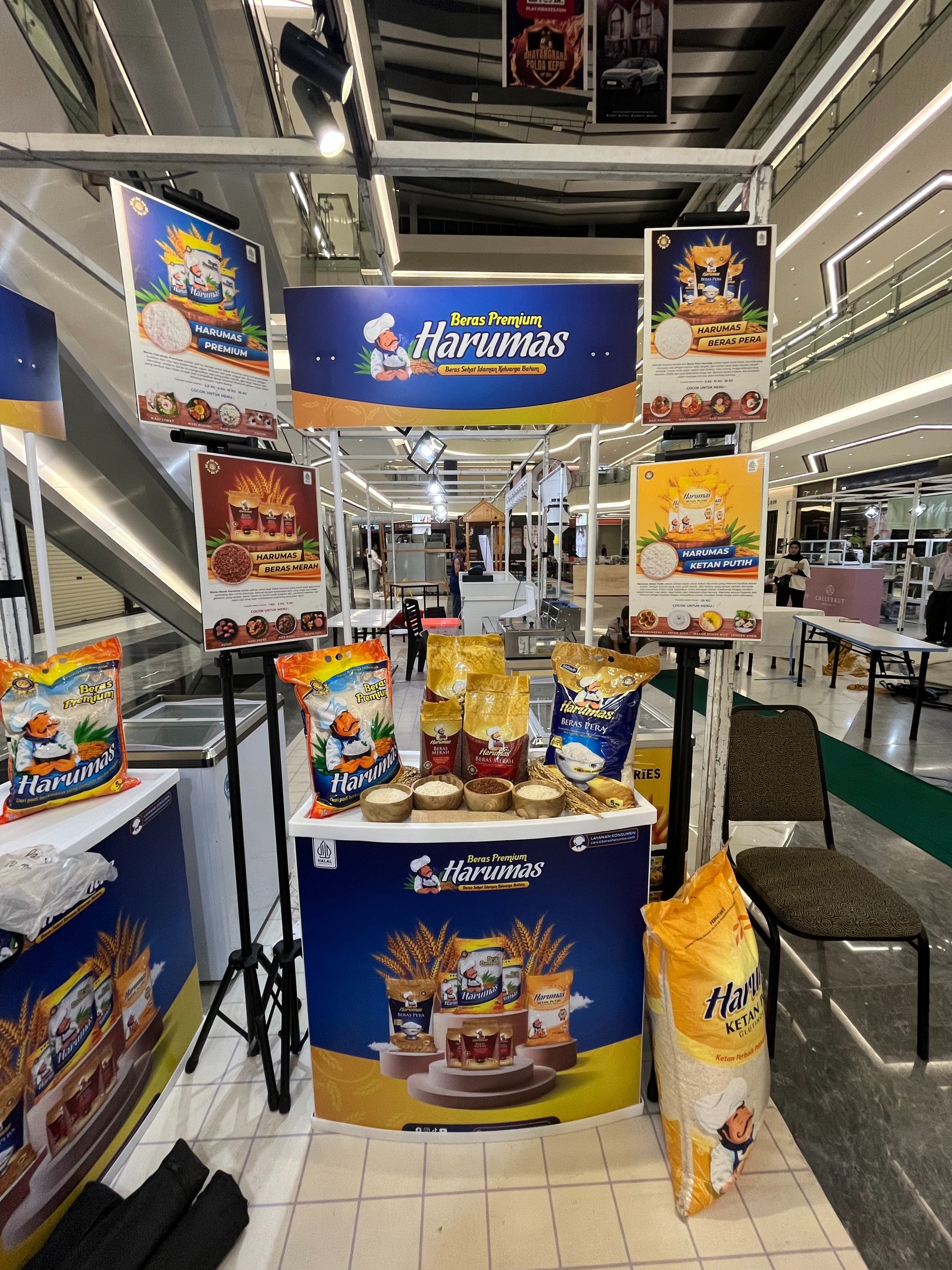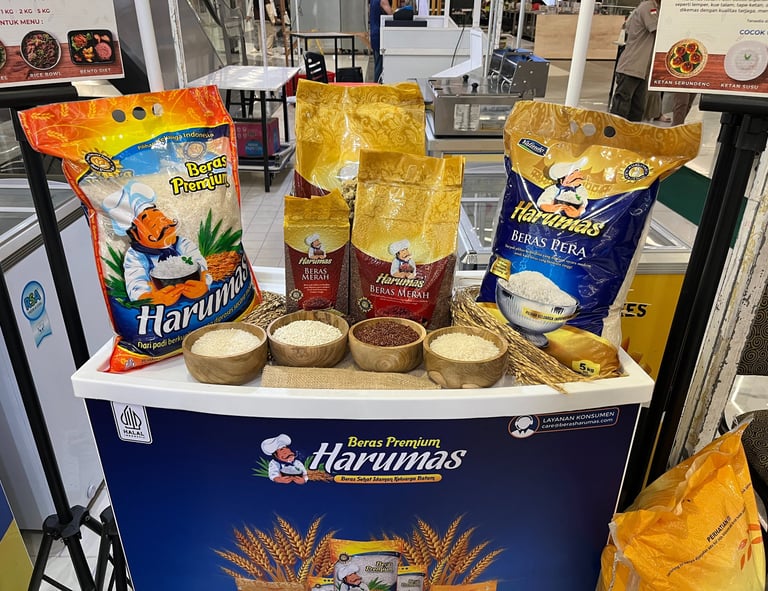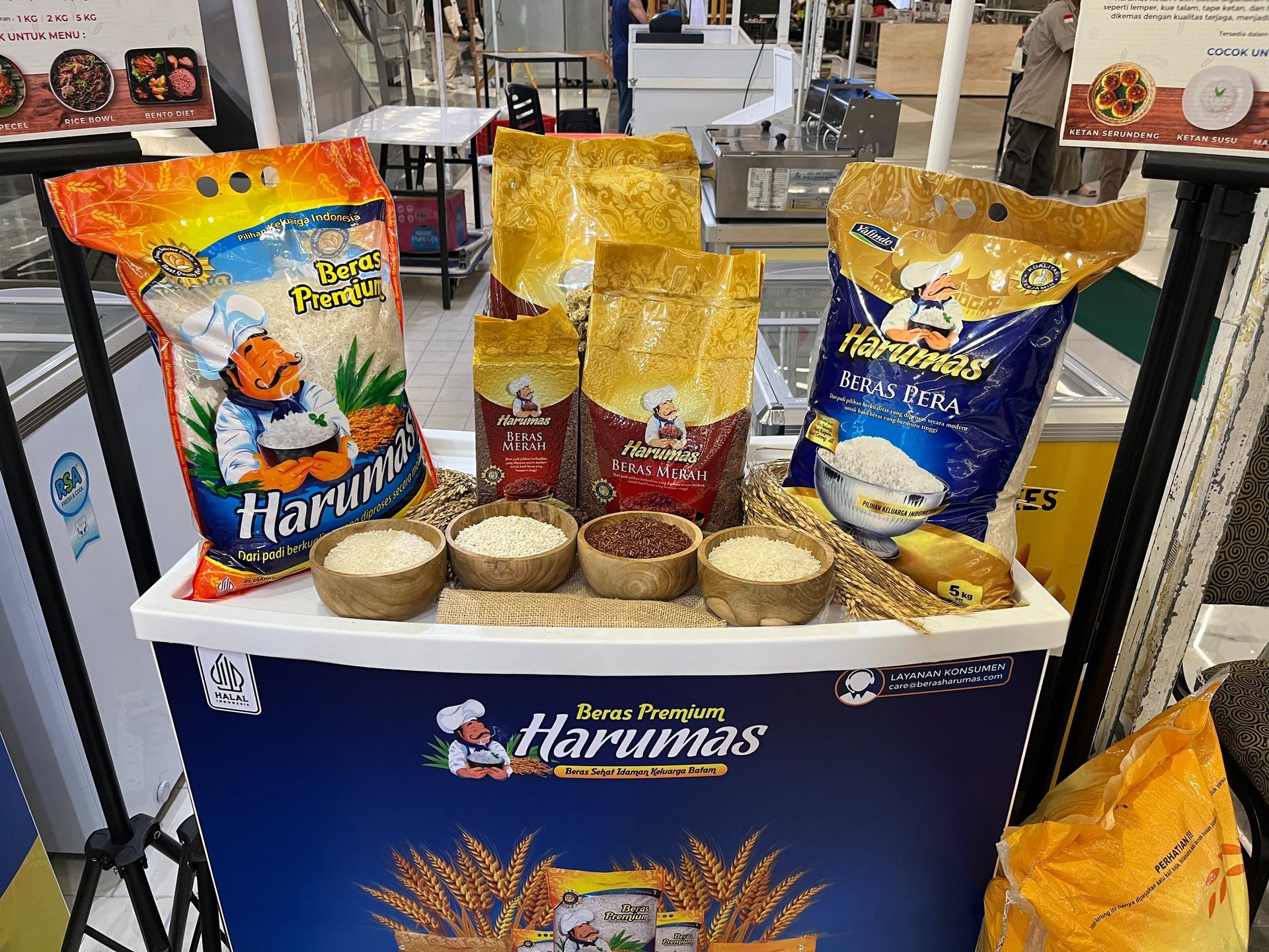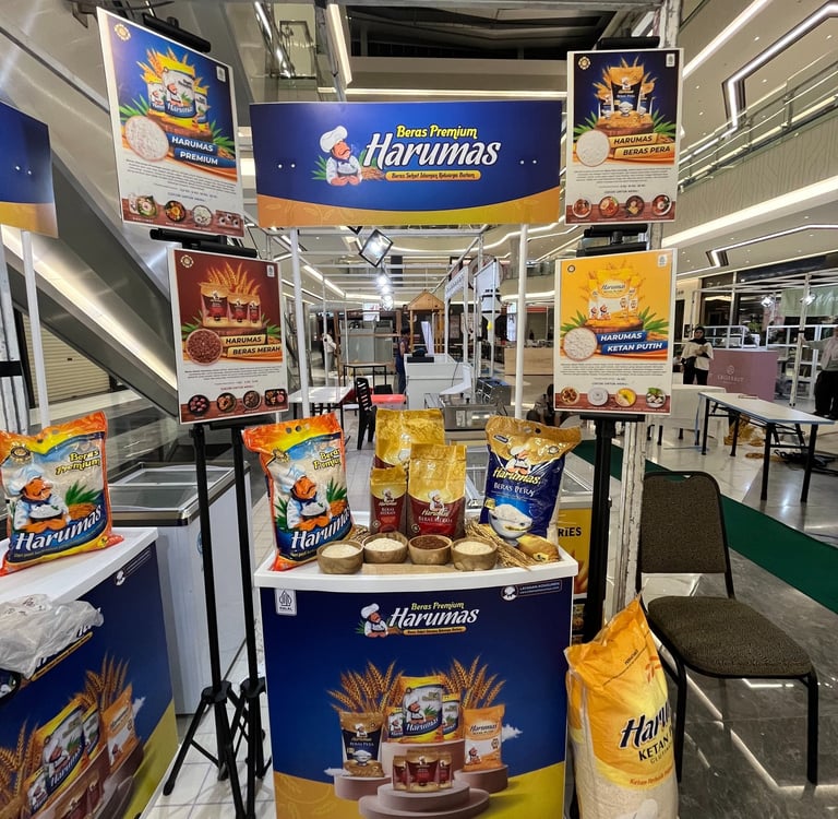Stand Beras Harumas juga menampilkan display berbagai jenis produk beras Harumas yang terdiri dari Beras Harumas Premium (pulen), Beras Harumas Pera, Beras Harumas Merah, dan Beras Harumas Ketan. Masing-masing jenis beras disajikan dalam mangkuk kayu berisi sampel butiran beras, sehingga pengunjung bisa melihat langsung perbedaan dan karakteristik masing-masing varian beras.