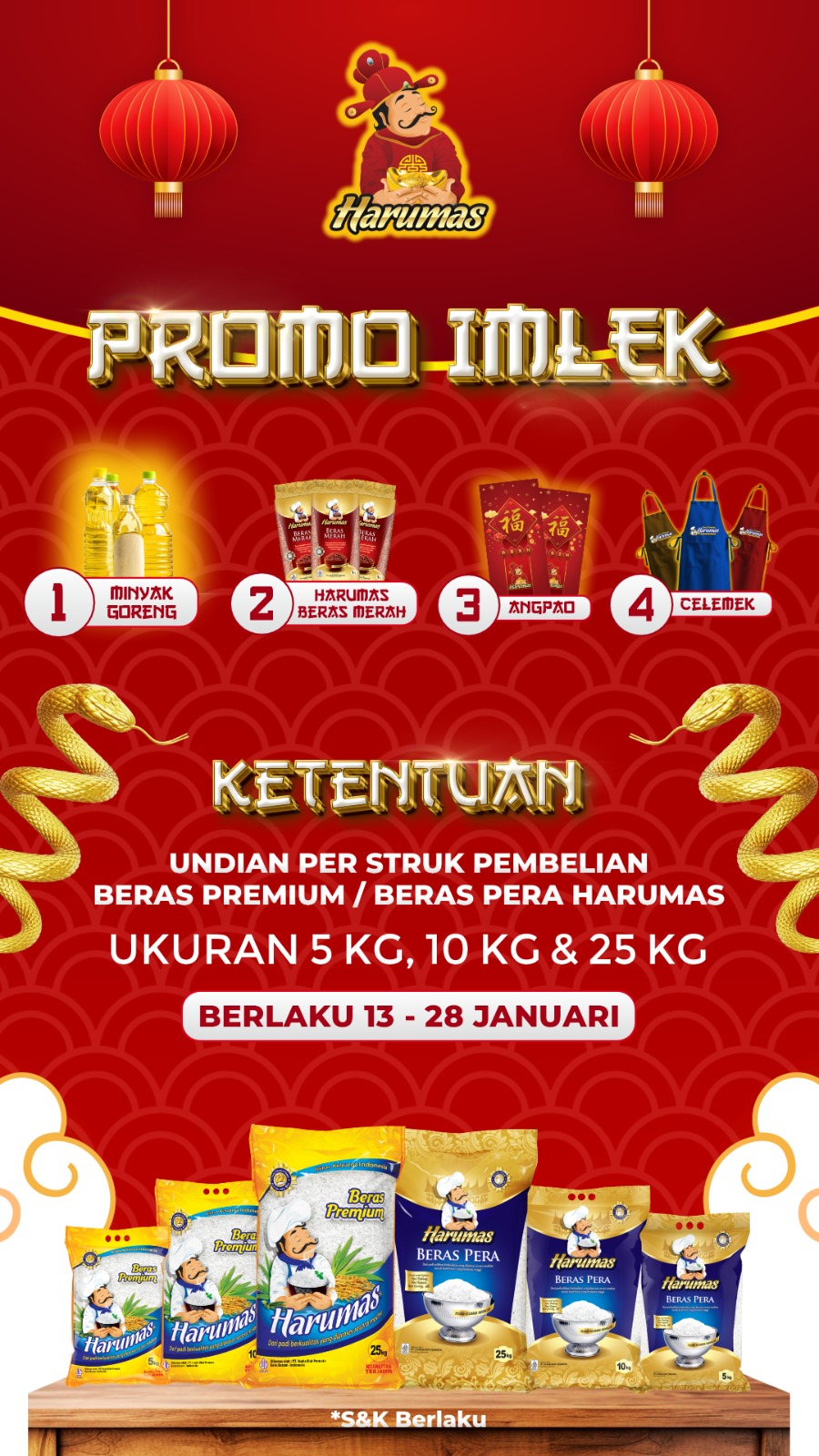Sobat Harumas bisa menikmati kesempatan memenangkan berbagai hadiah menarik selama periode 13 Januari hingga 28 Januari 2025 dengan ketentuan satu struk per klaim hadiah. Bagi pelanggan yang beruntung, tersedia berbagai hadiah menarik, yaitu; minyak goreng, beras merah, angpao, dan celemek ekslusif Harumas.